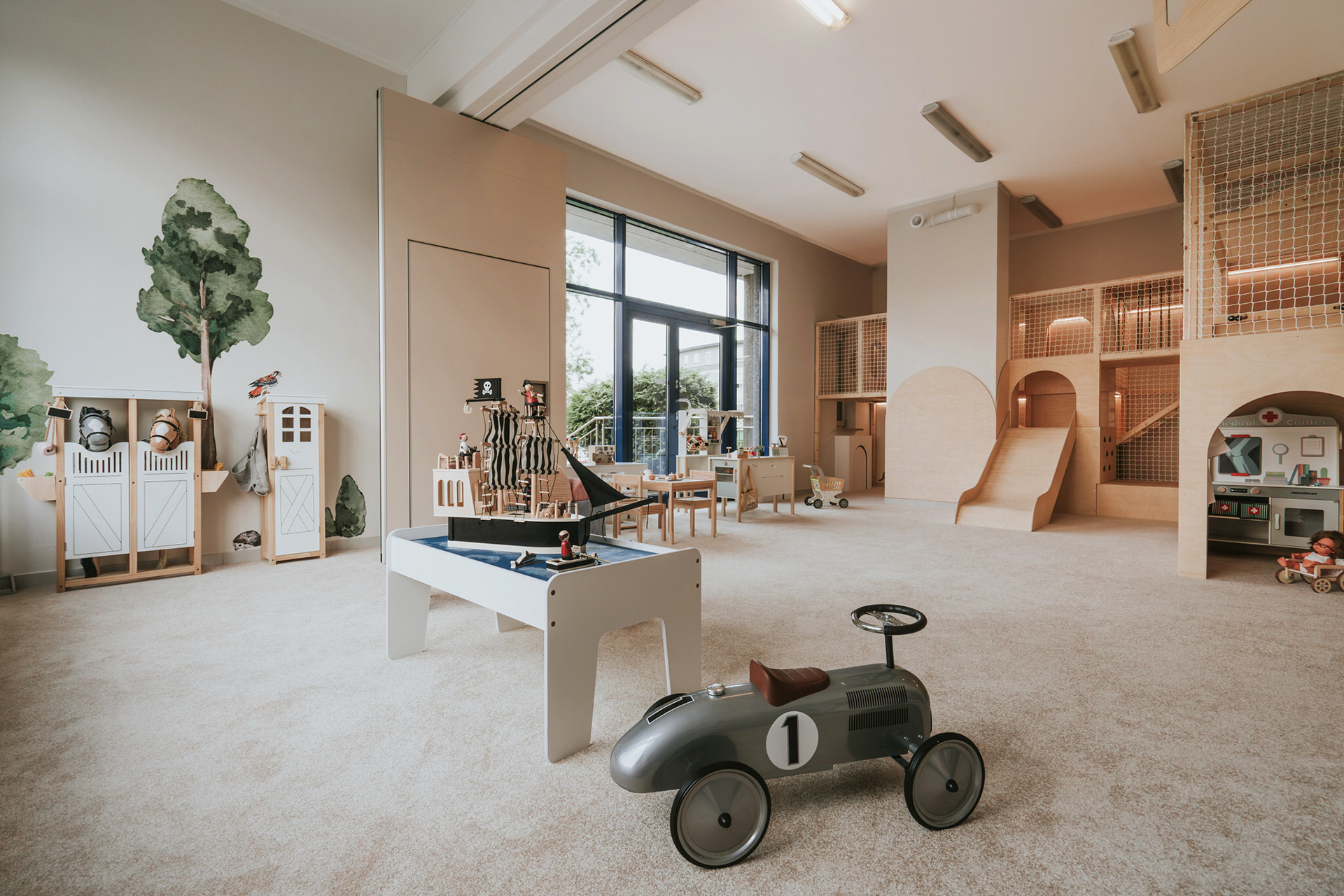 Zaprojektowana przez Izę i Monikę z Interio Studio Projektowe przestrzeń łączy nowoczesny design, skandynawską funkcjonalność oraz retro detale, tworząc przytulne i kolorowe miejsce idealne dla rodziców z dziećmi. Bawiarenka o powierzchni 160 m² oferuje kawiarnię oraz bawialnię z drewnianym małpim gajem. W projekcie wykorzystano istniejące słupy do stworzenia bajkowych drzew. To jednak nie jedyne elementy, które przyciągają wzrok. Przestrzeń bawialni została zaprojektowana z myślą o rozwoju dzieci, z różnorodnymi strefami zabaw w stylu Montessori. Spójrzcie na poniższe zdjęcia.