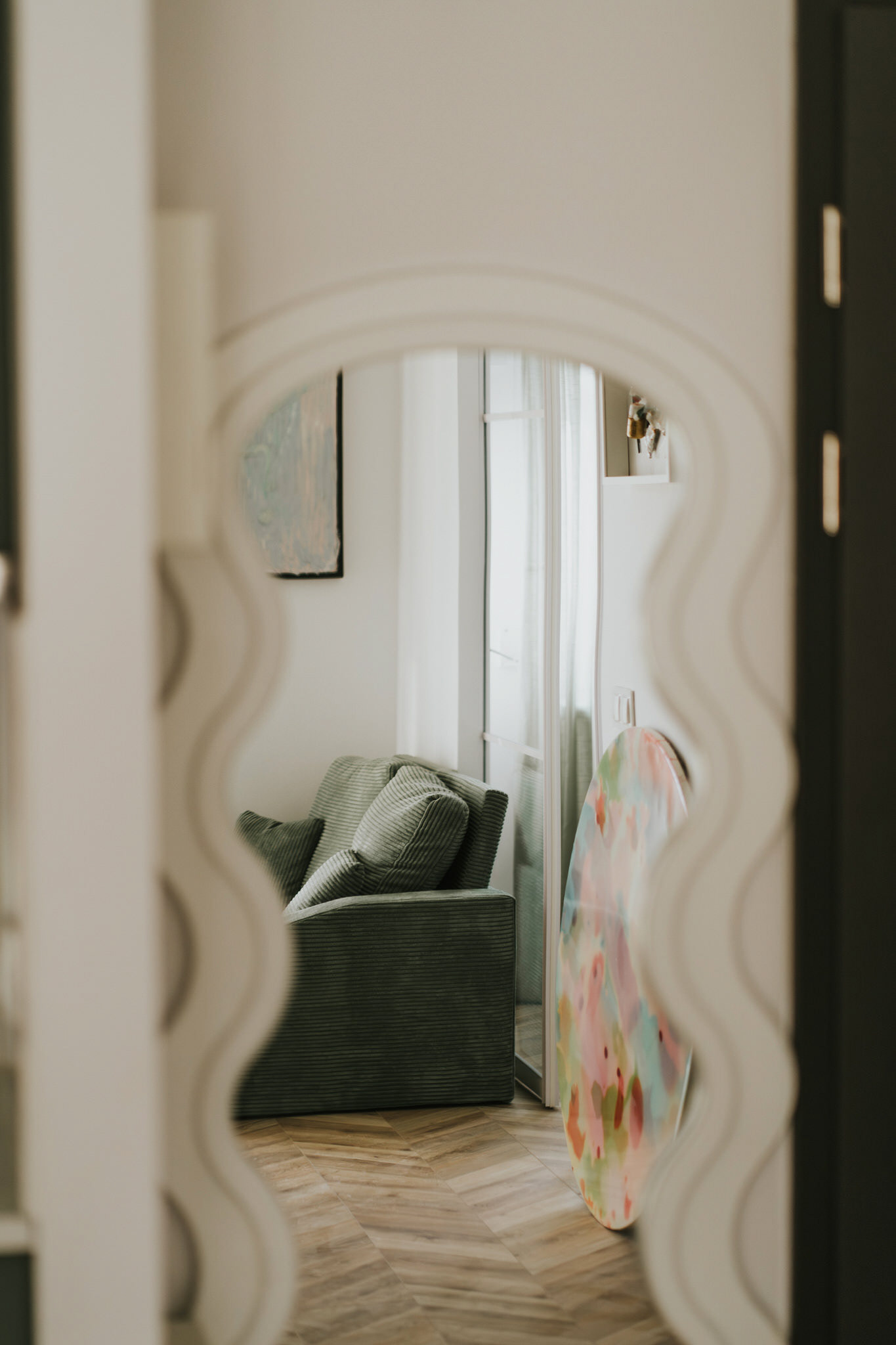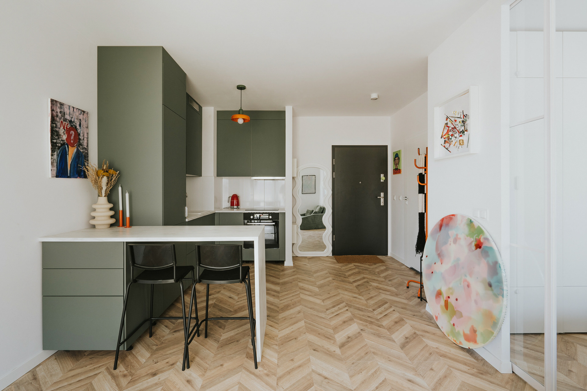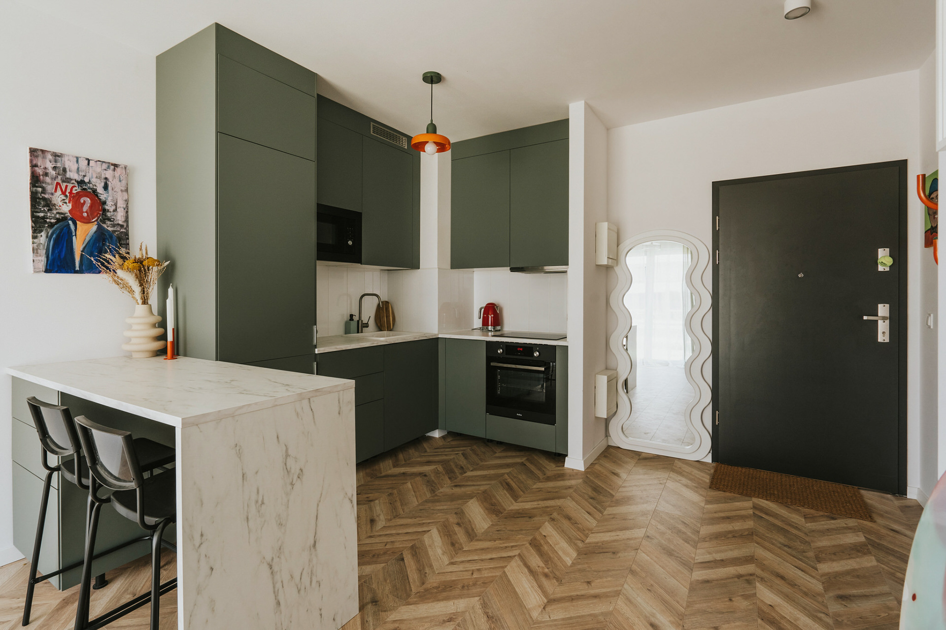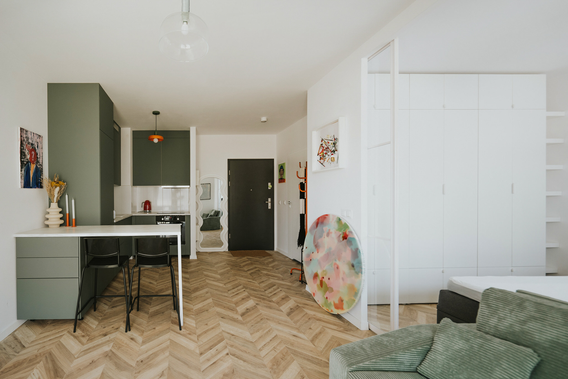 Krakowskie mieszkanie - 32m2 z zielonymi oraz pomarańczowymi akcentami. || Twórcy wnętrza: @1nshum & @arni_717 || Fotografia wnętrz: Projekt Miejsca. || Kraków, 2024.