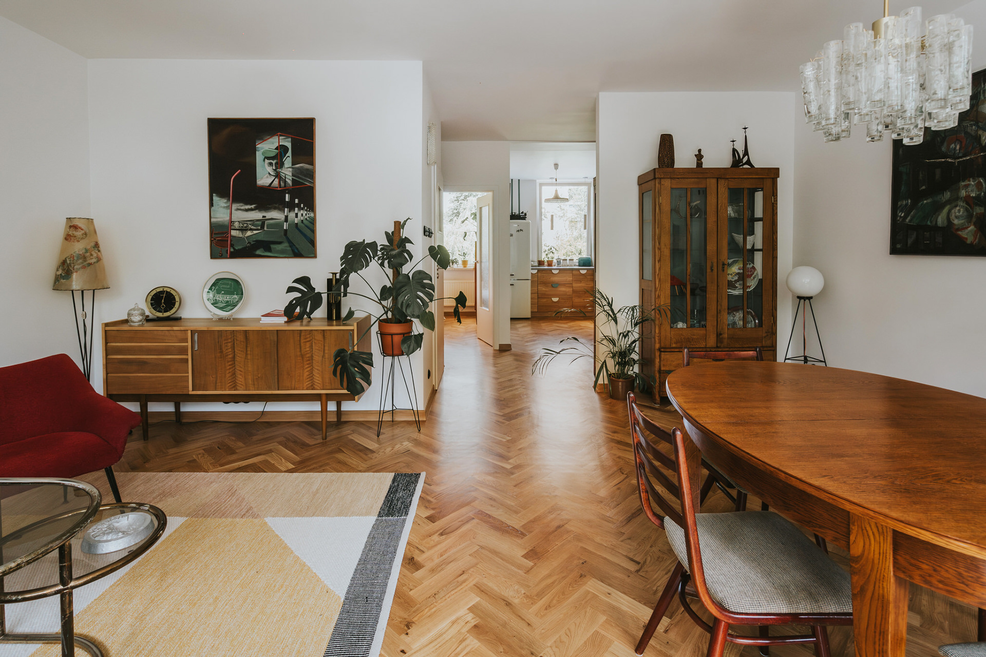 Nawiązanie do lat 60 XX w. połączone z prostymi meblami przedwojennymi / modernizm / eklektyzm